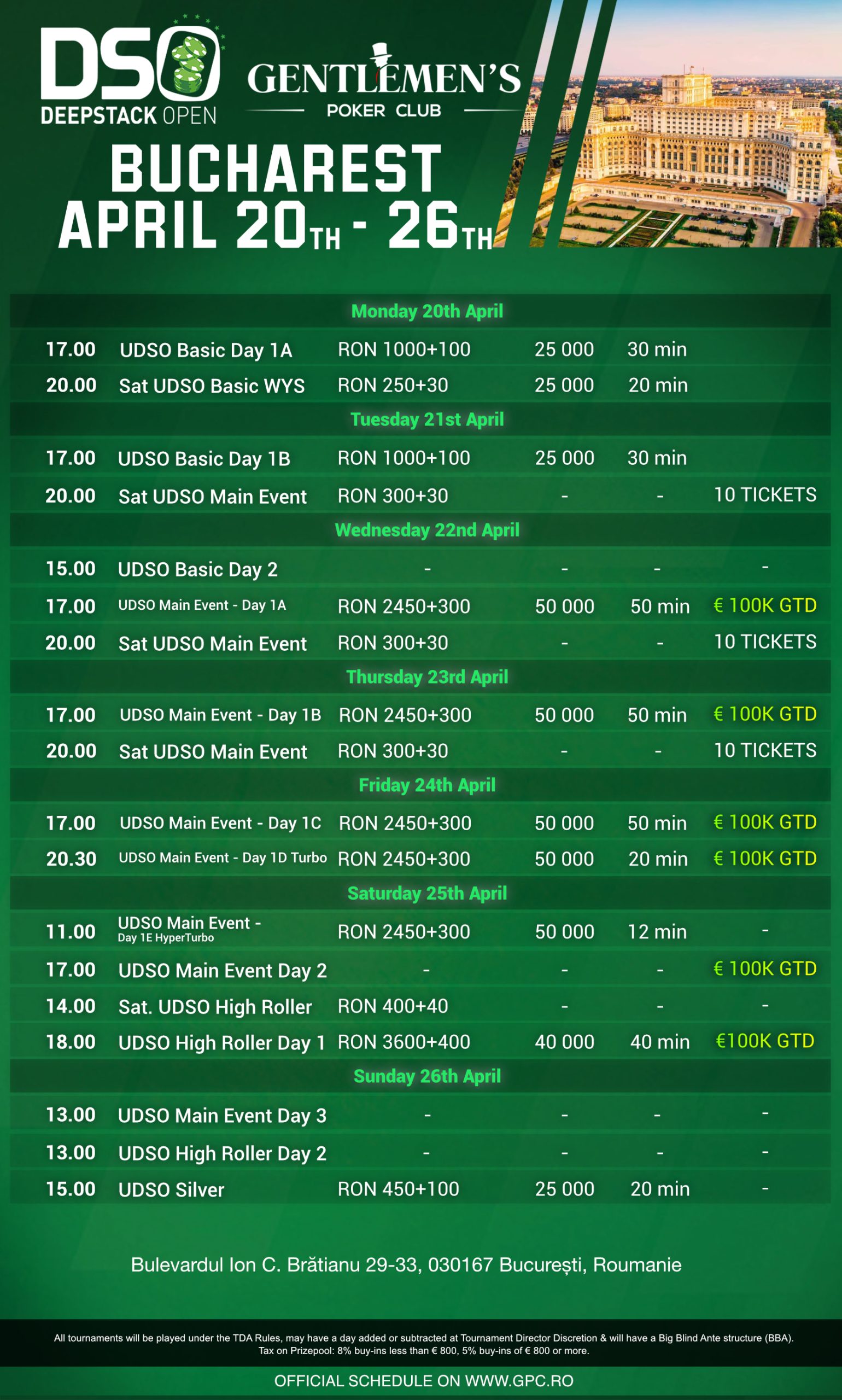 Held in the heart of the Romanian capital, DSO Bucharest has built a solid reputation over the years: friendly yet highly competitive, with deep stacks, long levels, and a welcoming poker community. The 2026 edition aims to continue this tradition, offering players the perfect mix of structure, comfort, and adrenaline.