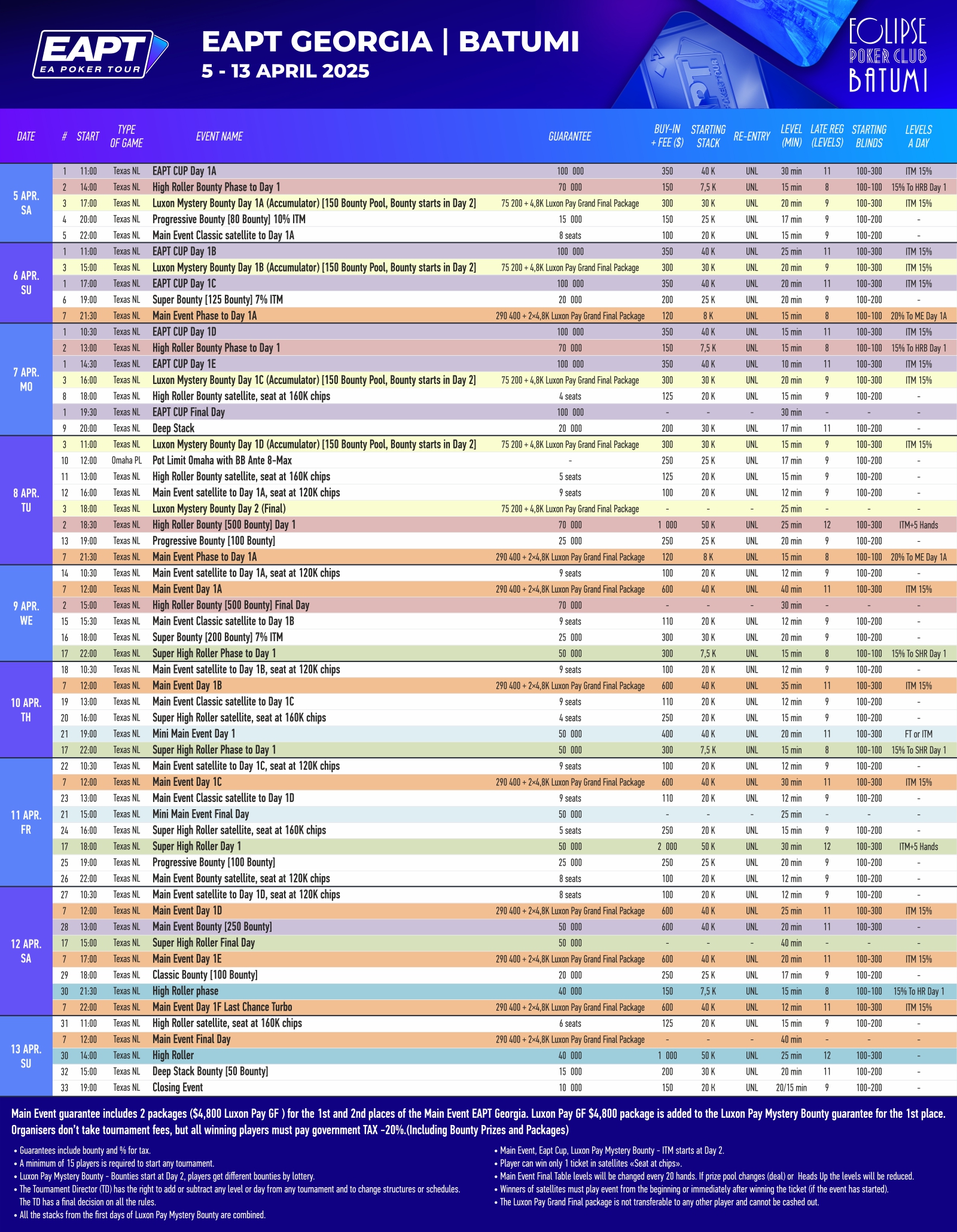 Just like last August, EAPT Georgia will be held at Eclipse Casino on the shores of glorious Batumi. All poker fans will once again gather in this beautiful city with two thousand years of history to compete not only for a piece of the million-dollar guarantee, but also to try to take home one of our signature EAPT trophies.
