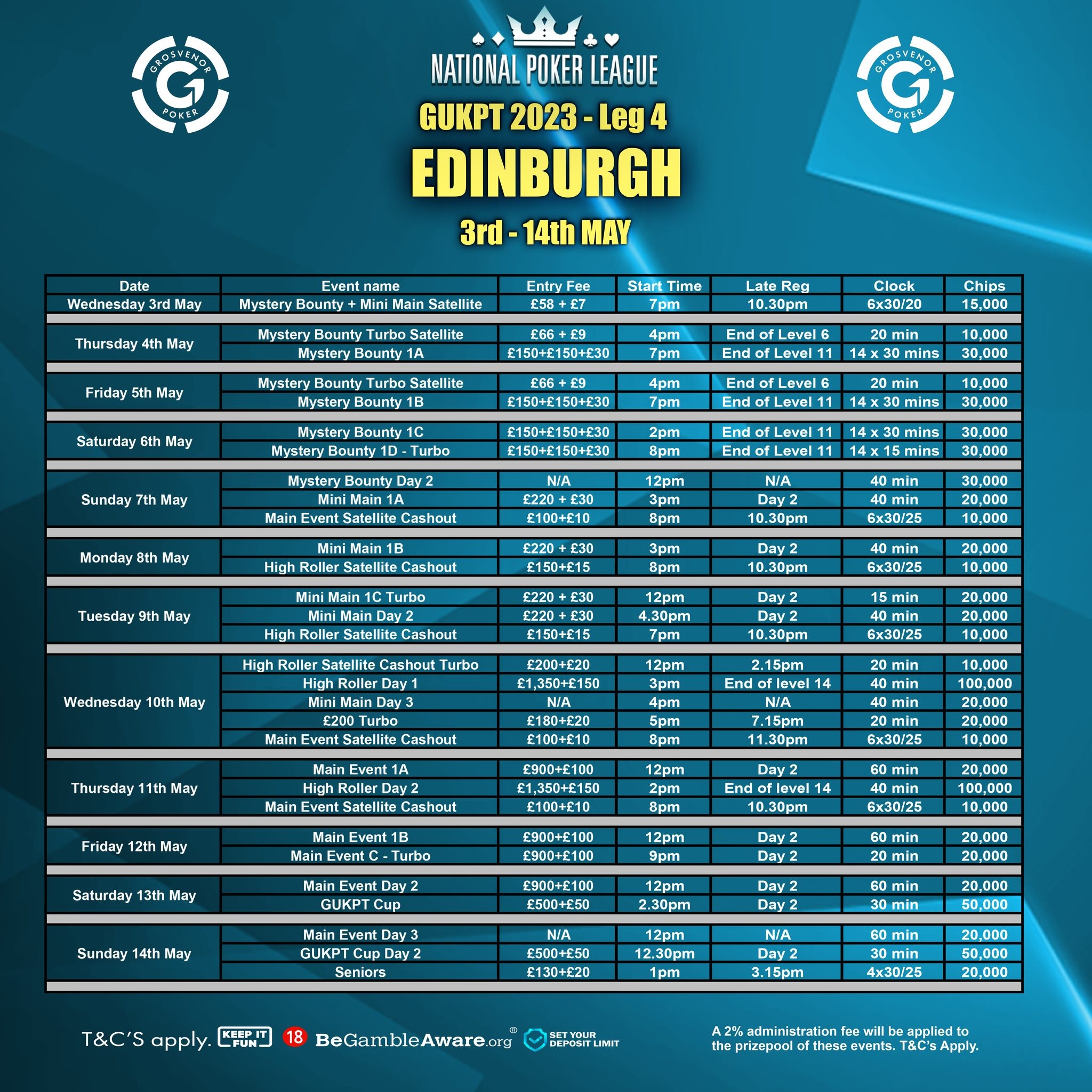 The Edinburgh schedule is packed with side events to suit buy-ins ranging from £130 + £20 Seniors event up to £1350 + £150 High Roller, and a slew of levels in between including a £150 + £150 + £30 Mystery Bounty, as well as a Mini Main, High Roller, GUKPT Cup, a Turbo, and a number of live satellites.