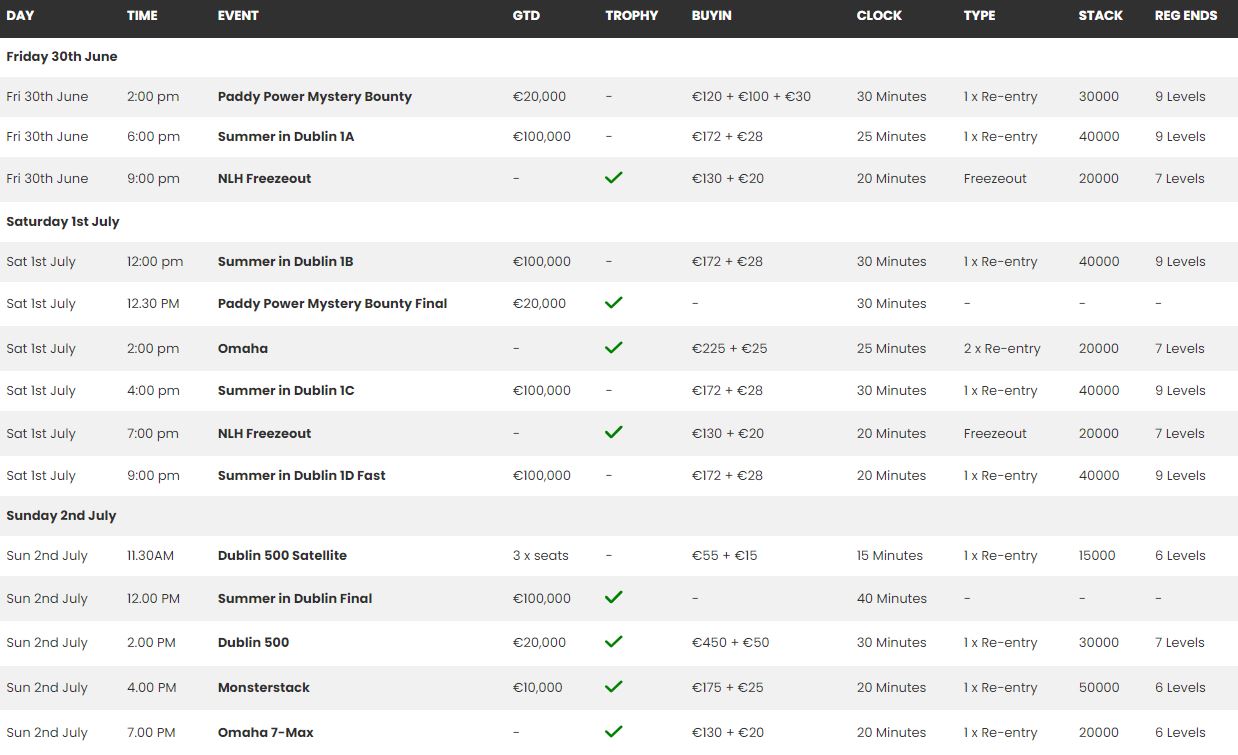 Join at Green Isle Hotel in Clondalkin from Friday 30th June until Sunday 2nd July 2023 for a range of amazing live poker events. Come experience the atmosphere in one of Ireland’s top poker venues in Dublin.