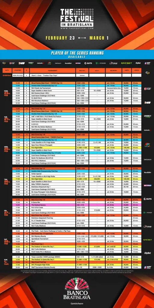 This will already be the sixth Festival Series in Bratislava since 2021, which says everything about how special this place is for their players. The city has a warm and relaxed vibe, and Banco Casino always delivers a great atmosphere, big turnouts, and an easy place for everyone to enjoy themselves. Kicking off 2026 here sets the tone for another full year, a year that will have more stops than you are used to from us!