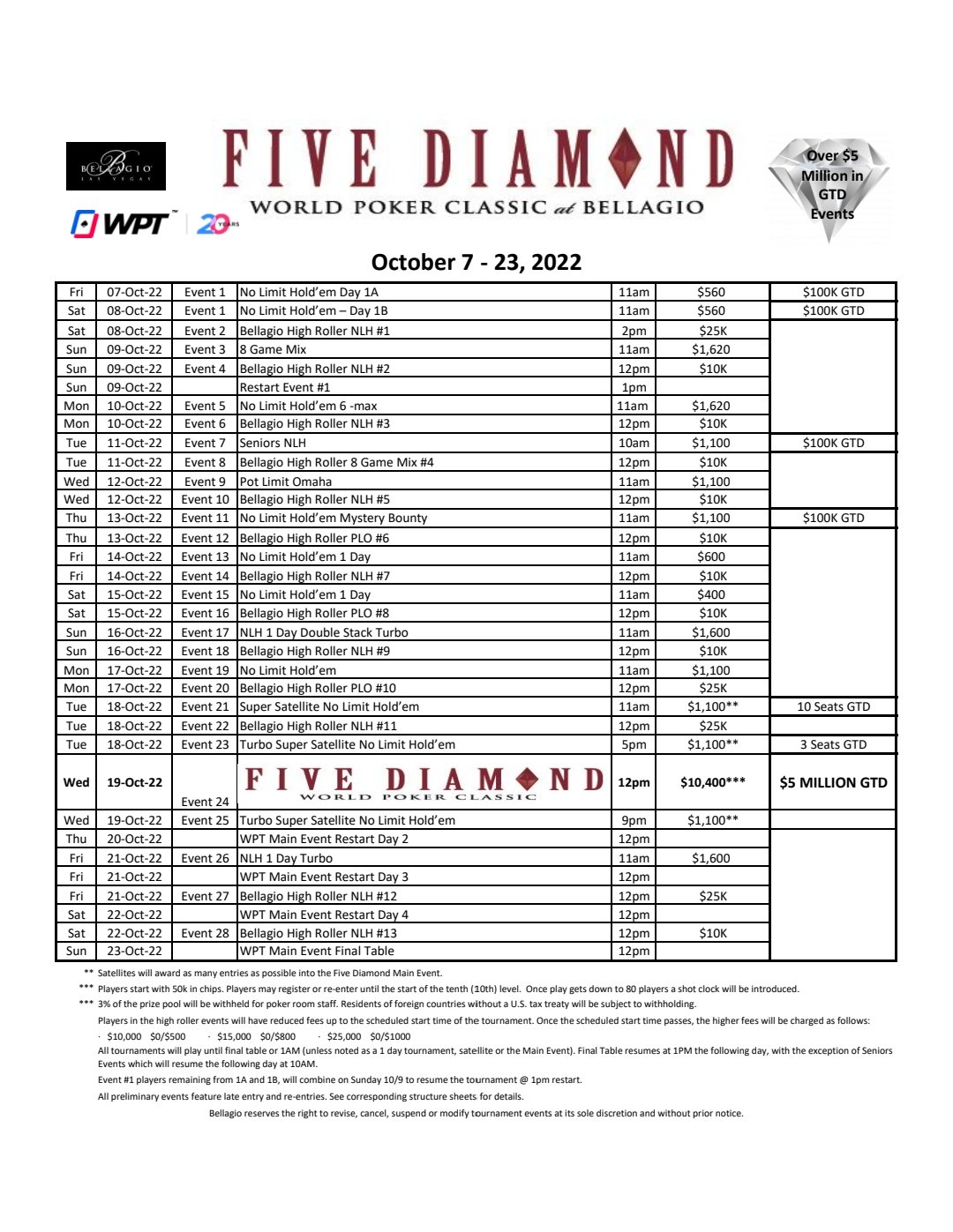 WPT Five Diamond World Poker Classic festival dates: