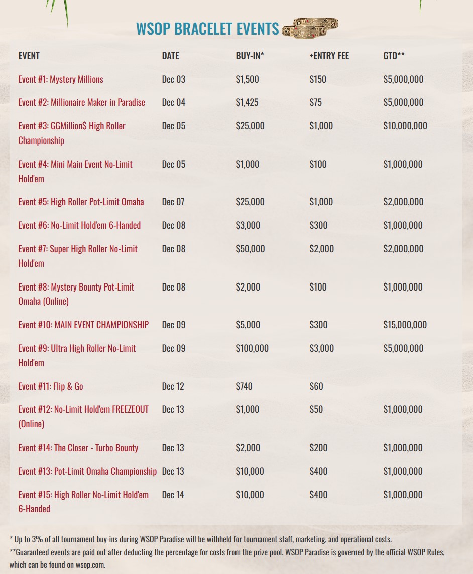 This coming winter, the Bahamas will host a WSOP bracelet series for the first time. The series will be highlighted by a $5,000 Main Event with $15 million guaranteed. A total of 15 bracelet events have been announced include a $1,500 Mystery Bounty, $25,000 GGMillion$, along with two pot-limit Omaha tournaments.
