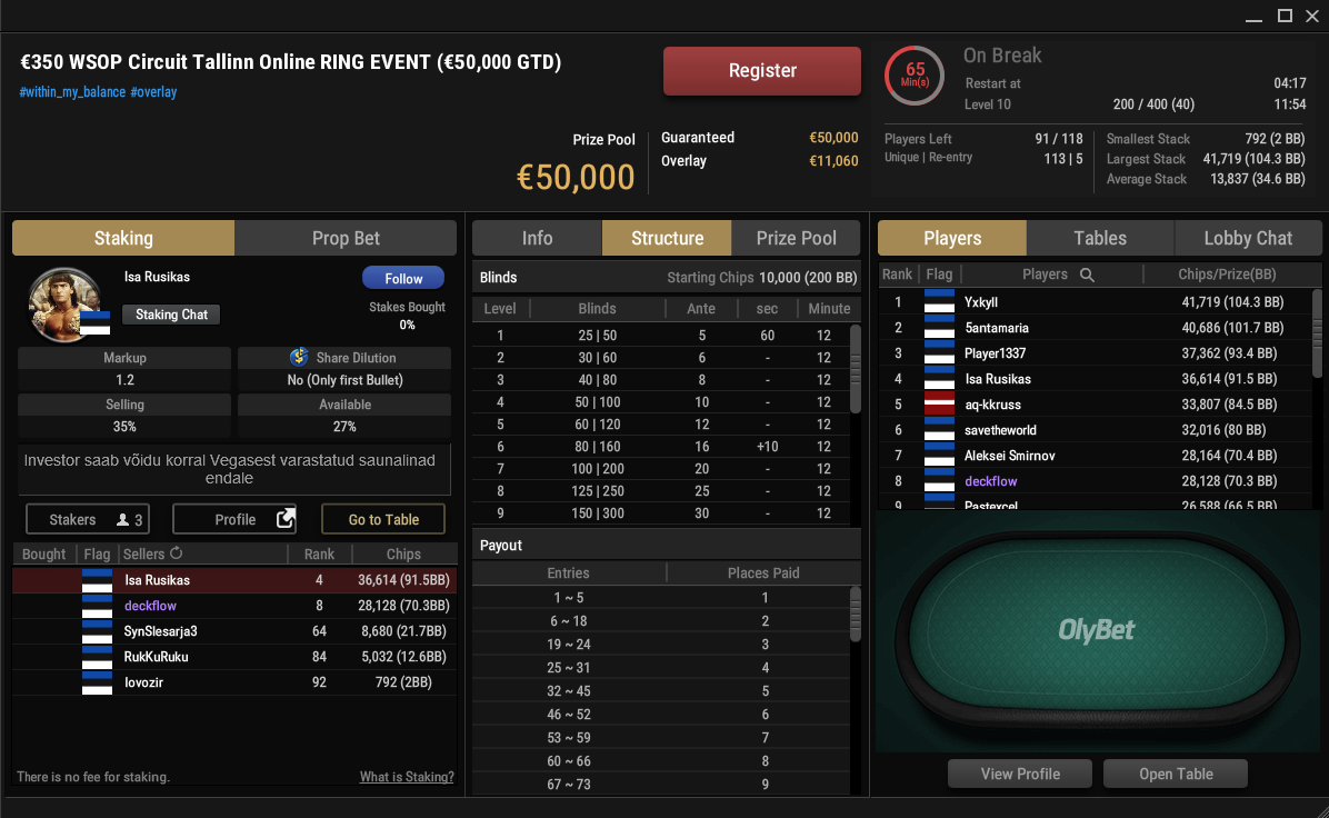 The 10th event of this WSOP Circuit here in Tallinn is actually not being played here at the casino but online at OlyBet! One of our previous winners - Aleksei Smirnov - is one of the players at the top of the chip count in this €350 tournament with as much as €50,000 guaranteed in the prize pool. As we post this there's a huge overlay so if you have some free time, jump in and play and take the chance of getting one of the Circuit rings.