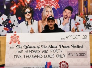 The autumn version was even bigger with 1,326 entries battling it out in October in the 2022 MPF Grand Event to generate a €636,450 prize pool. Italy’s Mirko Mostaccio was the hero of the event after winning the €136,670 top prize after a deal (below with a pre-printed cheque for the original 1st prize before the deal)