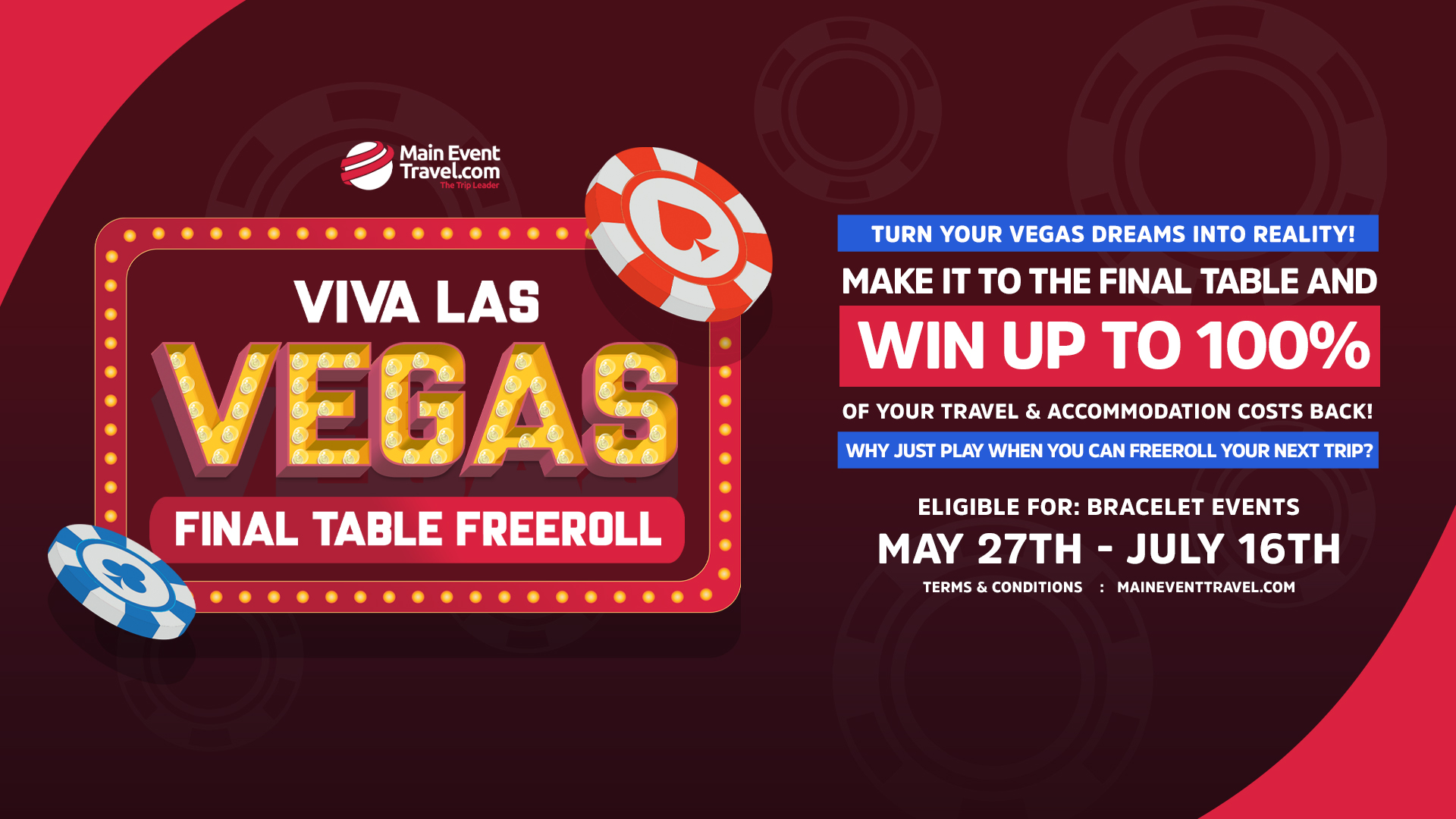 Click the Promotions tab drop-down to see a list of current Promotions including our exclusive #FinalTableFreeroll where you can win back up to 100% of Tournament Travel booked with MET!